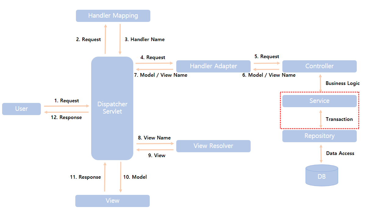 이번 포스팅은 위의 스프링 MVC구조에서 빨간 박스에 포함되는 내용에 대해 적어보고자 합니다.