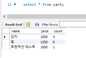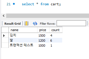 [ 6. Service단에서 트랜잭션을 위한 어노테이션이 추가되지 않았기 때문에 정상 실행된 insertCart에 의해 데이터가 반영된 것을 확인 ]