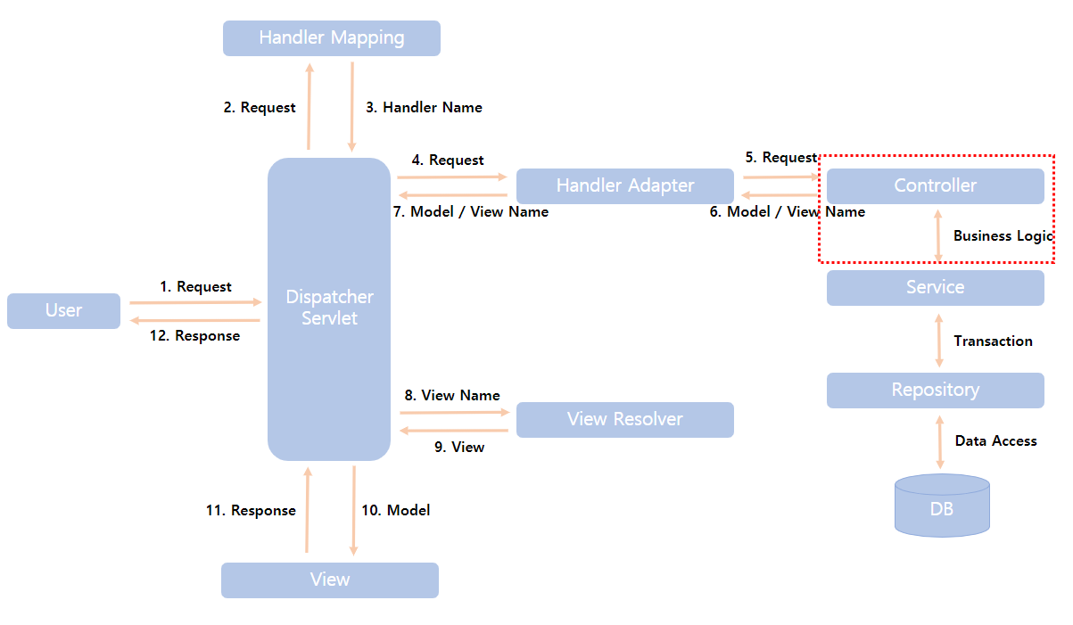 이번 포스팅은 위의 스프링 MVC구조에서 빨간 박스에 포함되는 내용에 대해 적어보고자 합니다.
