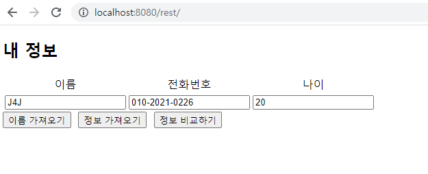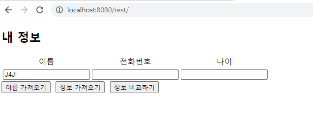 정보 가져오기 버튼을 누르게 되면 이름, 전화번호, 나이를 모두 스프링에서 가져옵니다.