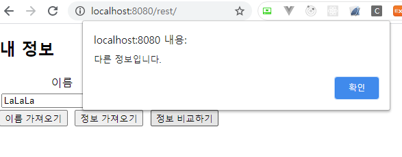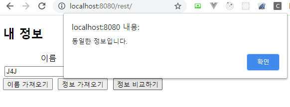 정보 비교하기 버튼을 누르게 되면 페이지에 보이는 데이터를 가지고 스프링에서 비교를 하여 데이터가 동일한지 여부를 알림창으로 보여줍니다.