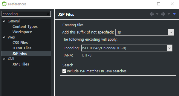 STS 상단의 Window → Preferences -> encoding 검색 → JSP Files에서 Encoding을 UTF-8로 설정 후 Apply