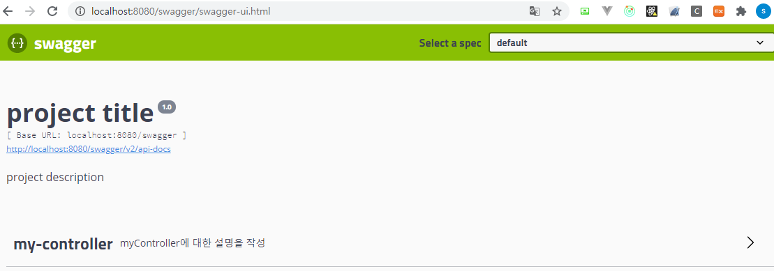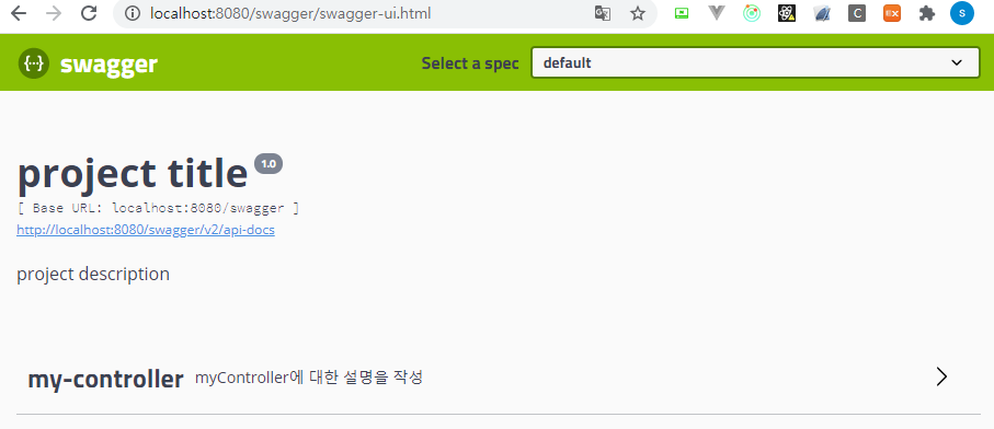 위와 같이 컨트롤러를 작성하고 스웨거를 다시 들어갈 경우 다음과 같이 MyController에 대한 정보가 나옵니다.