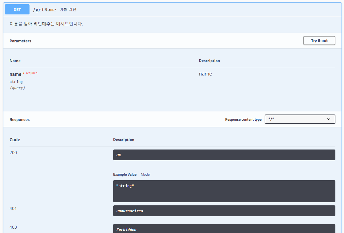 @ApiOperation(value = "이름 리턴", notes = "이름을 받아 리턴해주는 메서드입니다.") // 매핑되는 메서드에 대한 설명