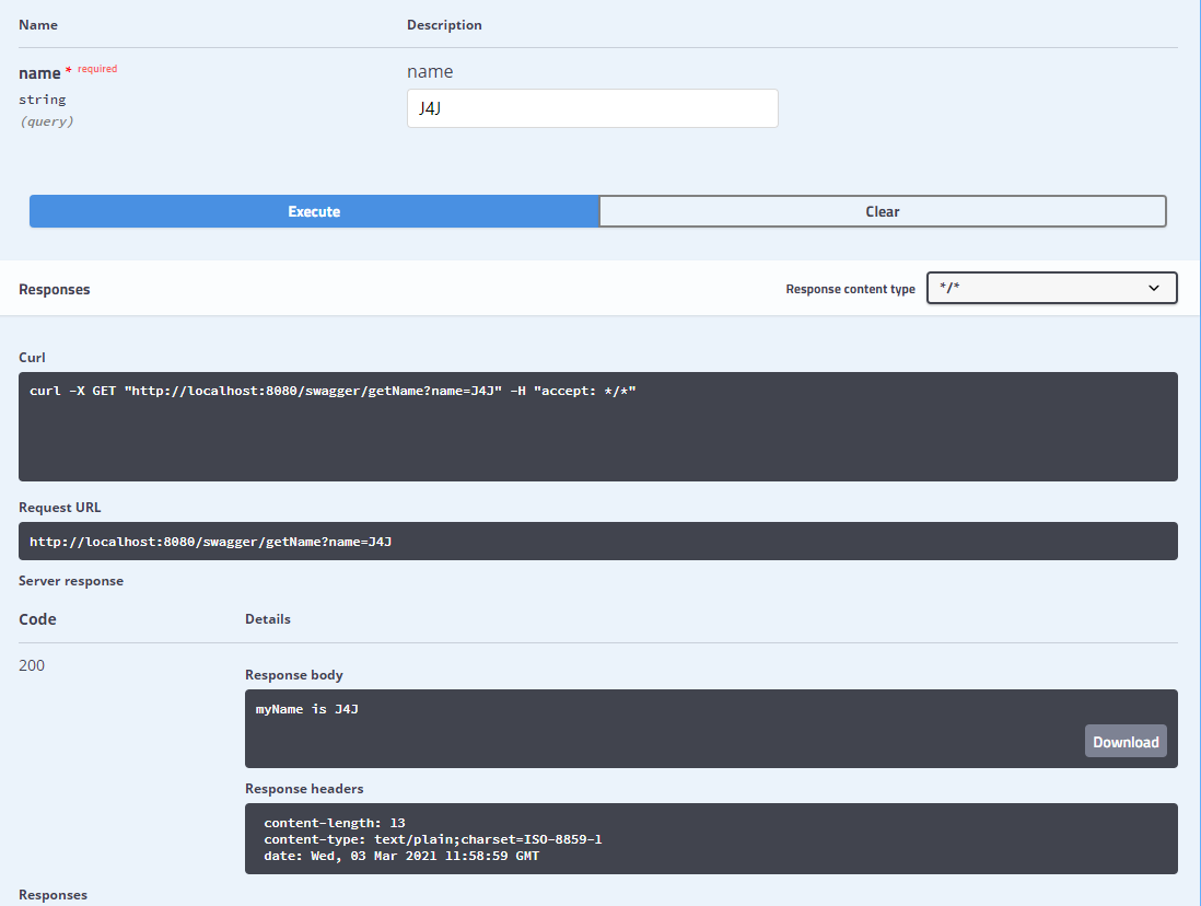 여기서 Try it out을 누르면 파라미터로 넣을 수 있는 값을 입력할 수 있도록 나오고 값을 입력한 뒤 Execute를 누를 경우 Rest API가 리턴해주는 Response값을 확인할 수 있습니다.