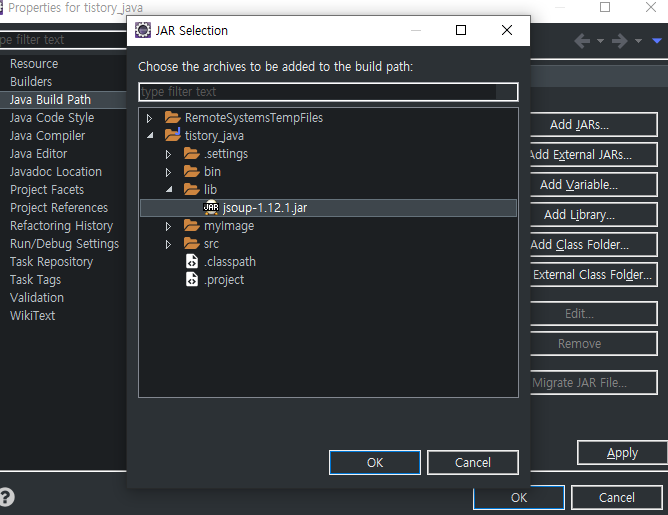 [ 4. Libraries탭 → Add JARs... → jar파일 경로에서 jar파일 선택 후 OK ]