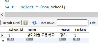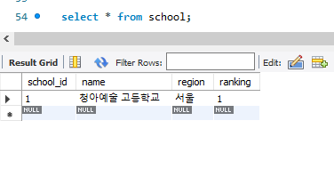INFO : com.spring.jpa.JPATest - [School(id=1, name=청아예술 고등학교, region=서울, ranking=1)]