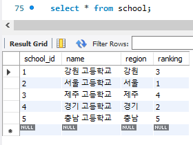 insert into school(name, region, ranking) values ('경기 고등학교', '경기', 2);