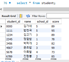 INFO : com.spring.jpa.JPATest - [Student(studentId=0000, name=김가네, school=School(id=5, name=충남 고등학교, region=충남, ranking=5), score=89), Student(studentId=1111, name=밥천국, school=School(id=5, name=충남 고등학교, region=충남, ranking=5), score=95), Student(studentId=1234, name=김고기, school=School(id=3, name=제주 고등학교, region=제주, ranking=4), score=89), Student(studentId=2345, name=정덮밥, school=School(id=1, name=강원 고등학교, region=강원, ranking=3), score=78), Student(studentId=3456, name=박찌개, school=School(id=2, name=서울 고등학교, region=서울, ranking=1), score=82), Student(studentId=4567, name=문초밥, school=School(id=3, name=제주 고등학교, region=제주, ranking=4), score=99), Student(studentId=5678, name=이족발, school=School(id=4, name=경기 고등학교, region=경기, ranking=2), score=73), Student(studentId=6789, name=진짬뽕, school=School(id=2, name=서울 고등학교, region=서울, ranking=1), score=85)]